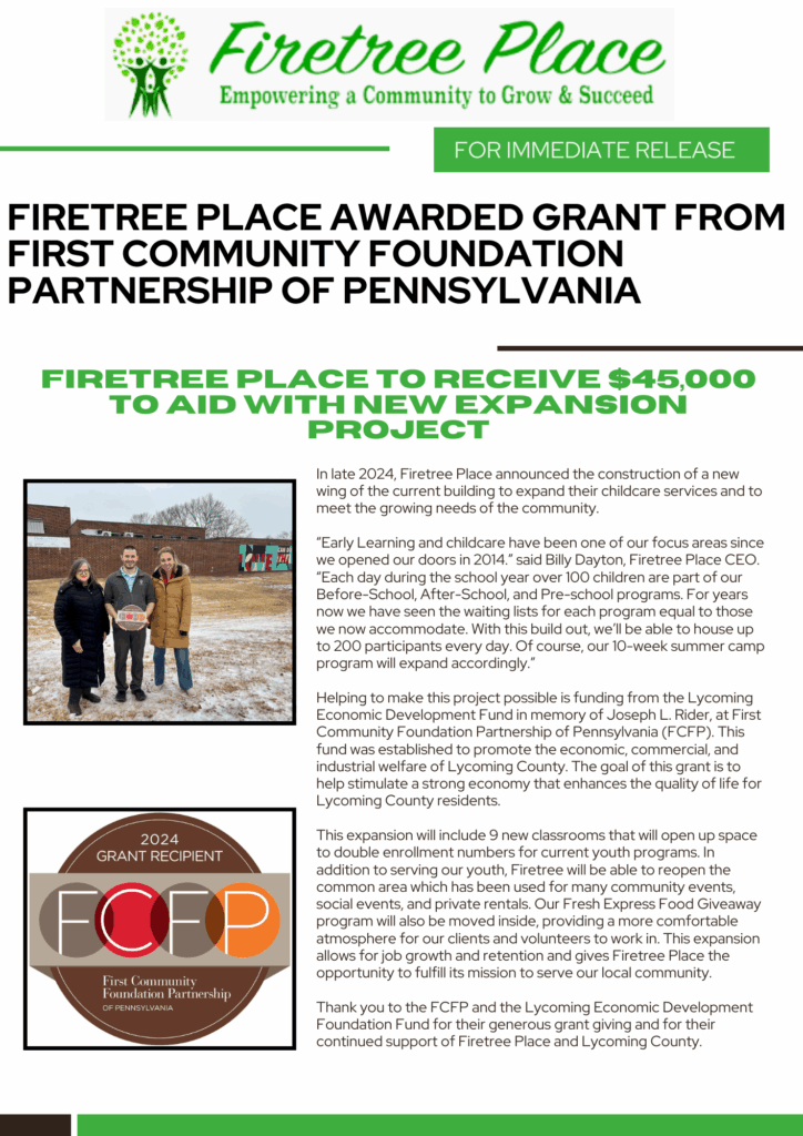 Here at Firetree Place, we rely on sponsorships and donations from like-minded businesses and individuals to support our mission. Our community and local businesses have made it possible for us to support our youth and families with vital programming. We wouldn’t be who we are without the generosity of the people who have loyally supported Firetree Place over the years. We just want to take the time to say THANK YOU for your support, and we hope to continue to grow and serve you for many years to come!